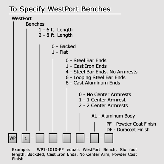 Choose six or eight foot length; zero or one center armrest; powdercoat or Duracoat finish; and color.
